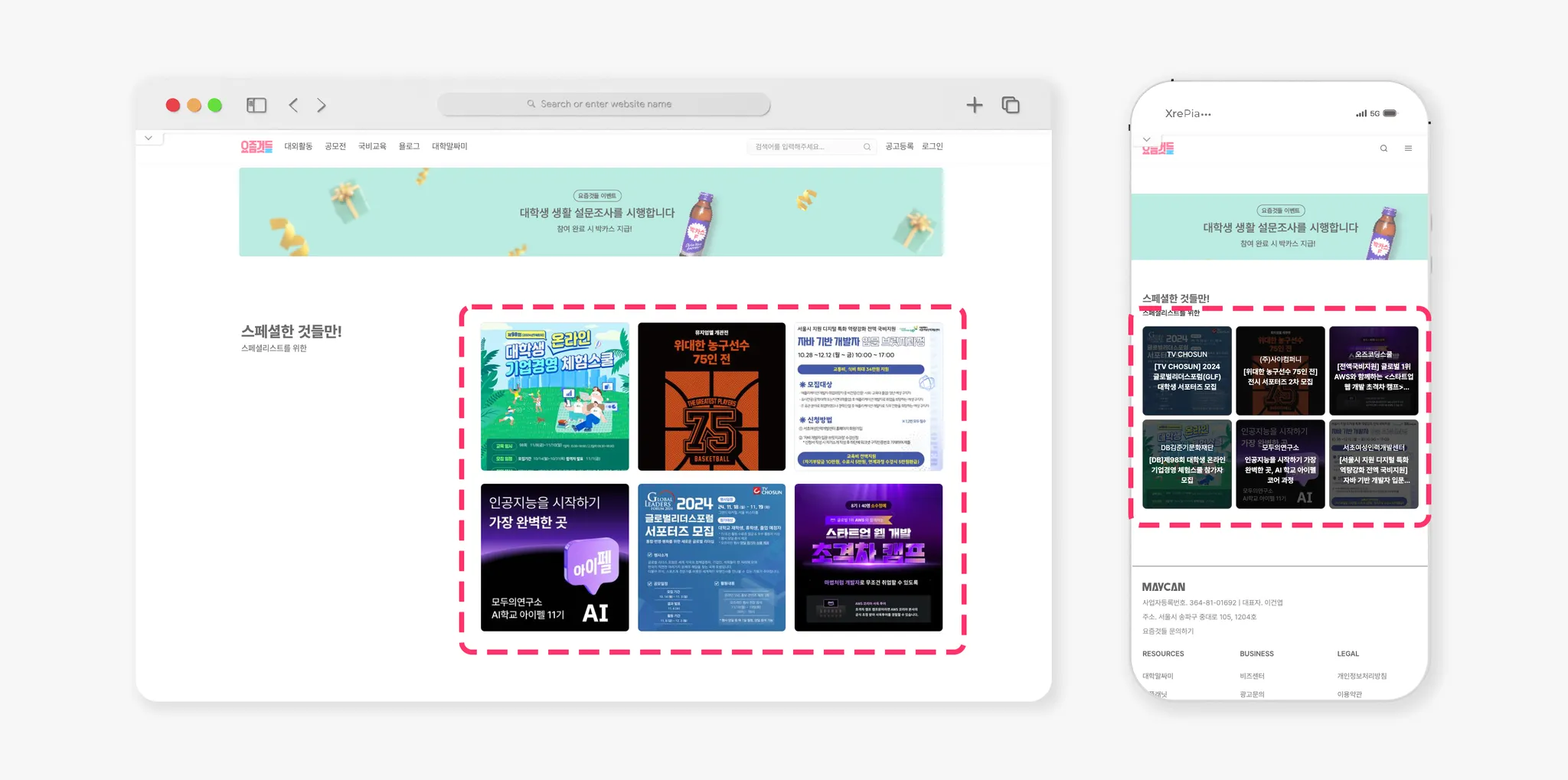 본 상품 특성상 주최주관명, 공고명과 함께 노출되기에, 시선을 끌수있는 2줄 이내의 메인 텍스트와 이미지 소재 정도로만 구성하는 것을 권장 드립니다. (배너가 노출되는 사이즈 자체가 작기에 텍스트가 3줄 이상 되면 가독성이 떨어질 수 있습니다.)