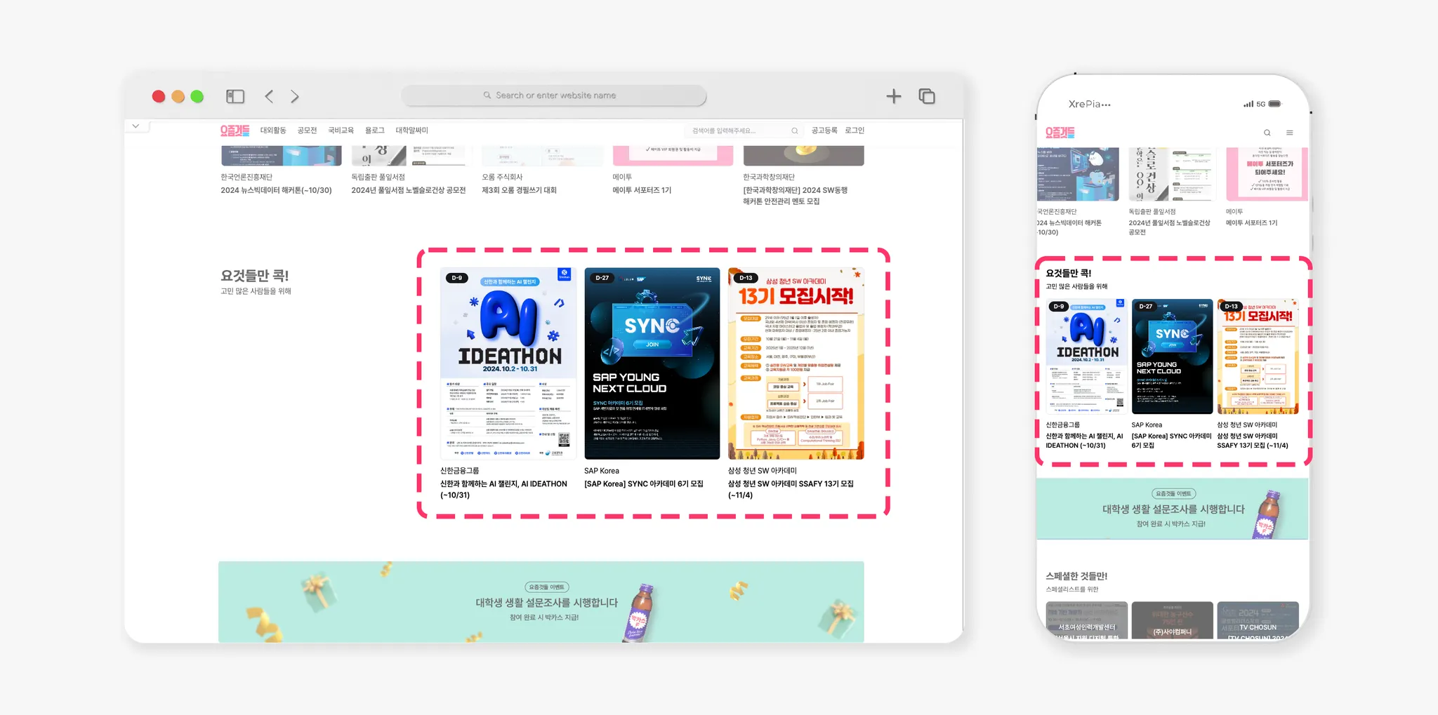 메인페이지 스크롤을 내리자마자 대형 포스터로 노출되며 대외활동/공모전/국비교육 홍보에 최적화된 상품입니다