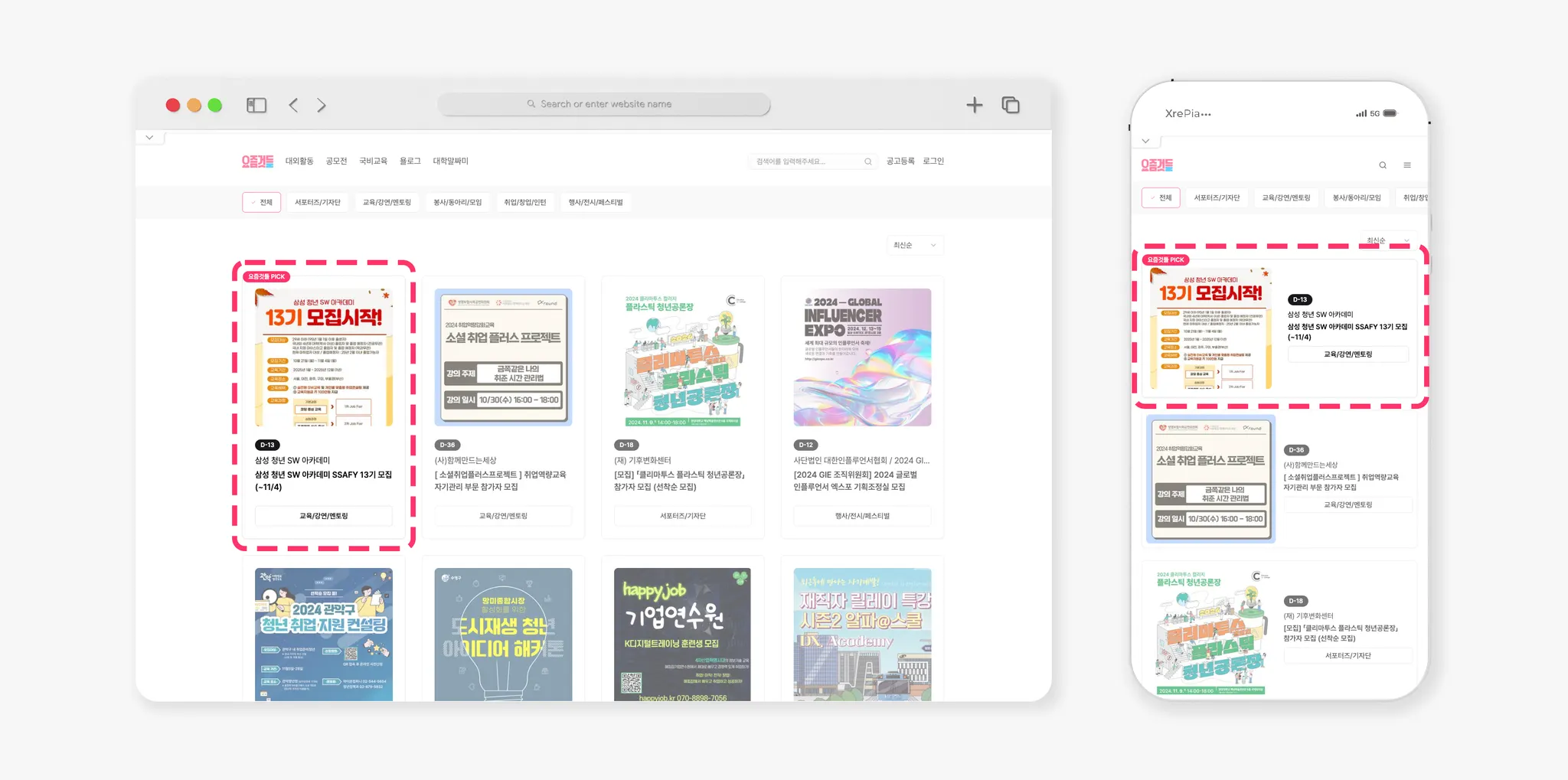 대외활동/공모전/국비교육 카테고리페이지 중 택1