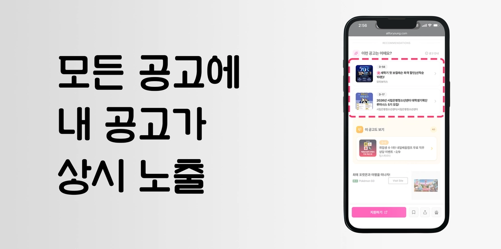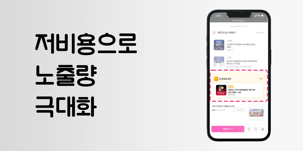 [B2]추천배너 | 모든 공고 상세페이지 하단 [이런 공고는 어떄요] 고정 | 60만원/2주 | 80만뷰 | 0.02 ~ 0.06% | 자연스러운 공고 관심도 증대 |