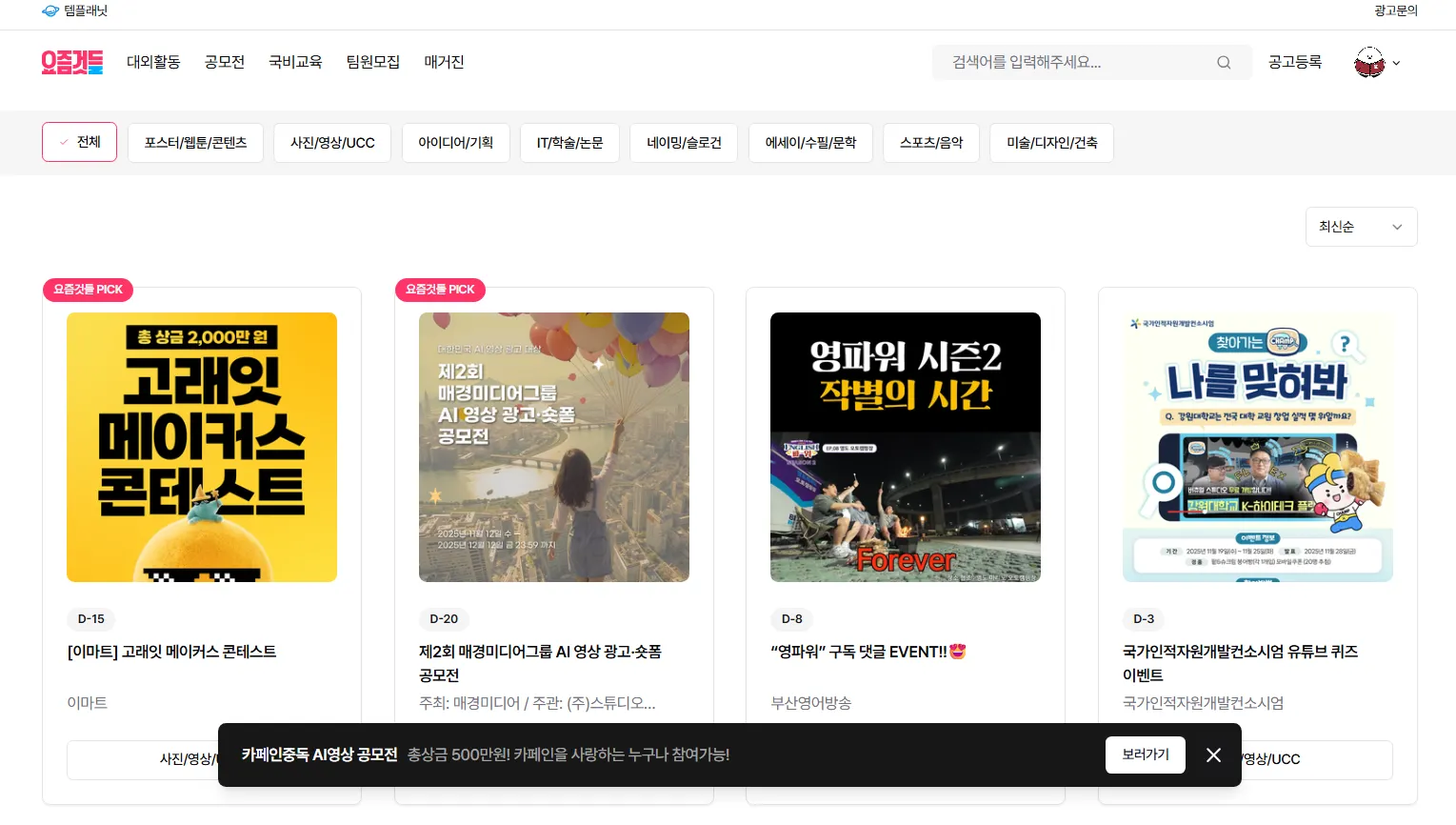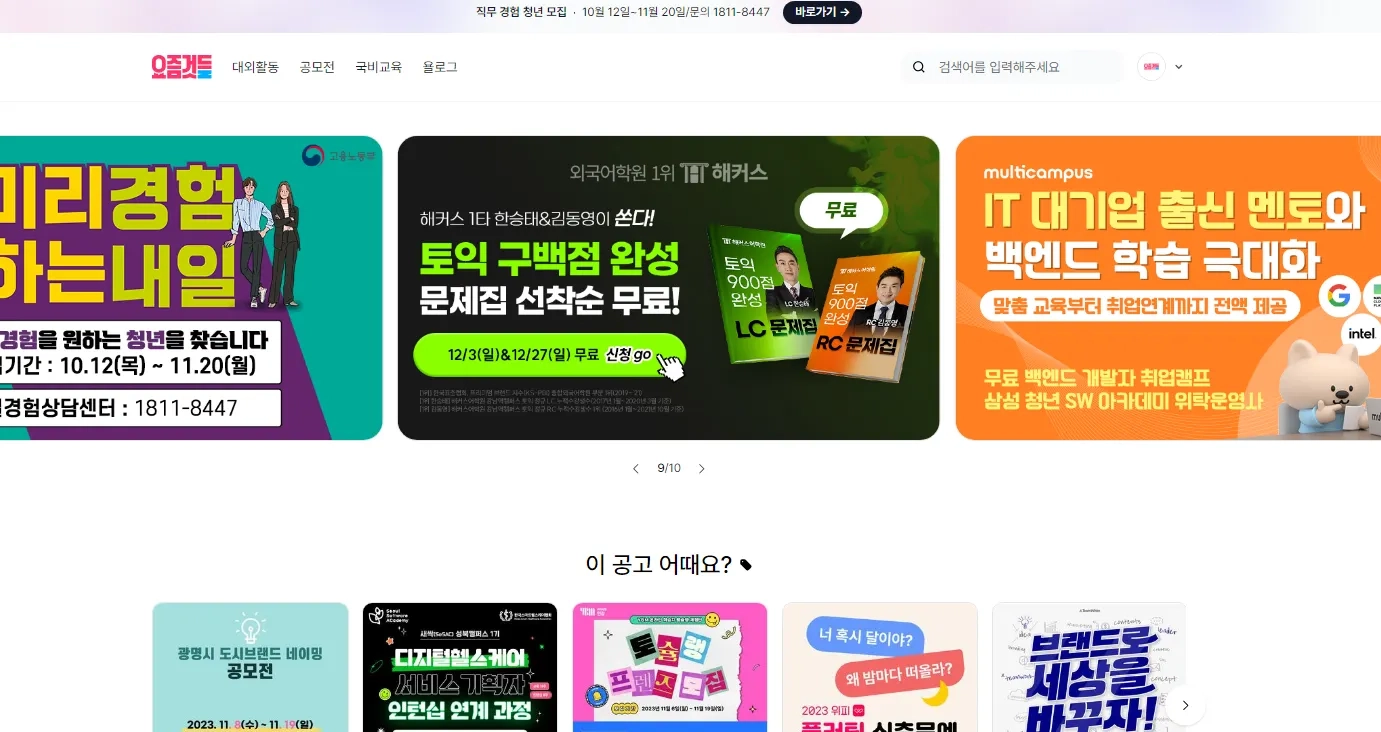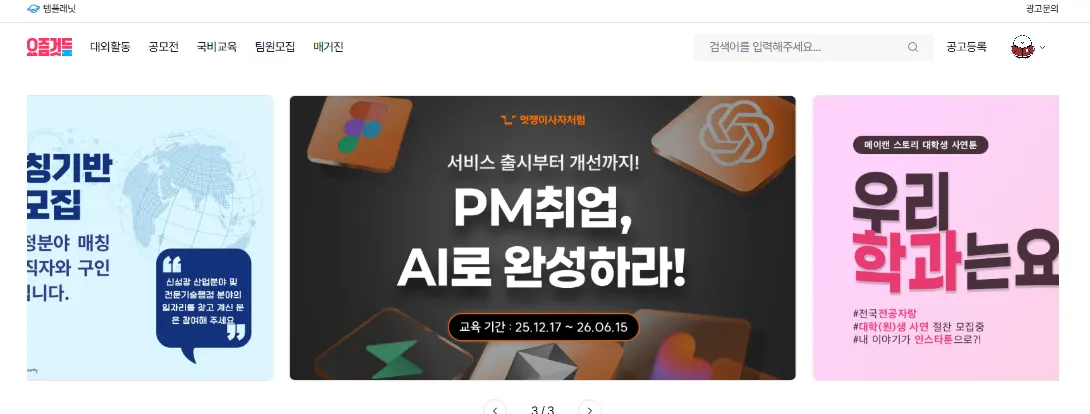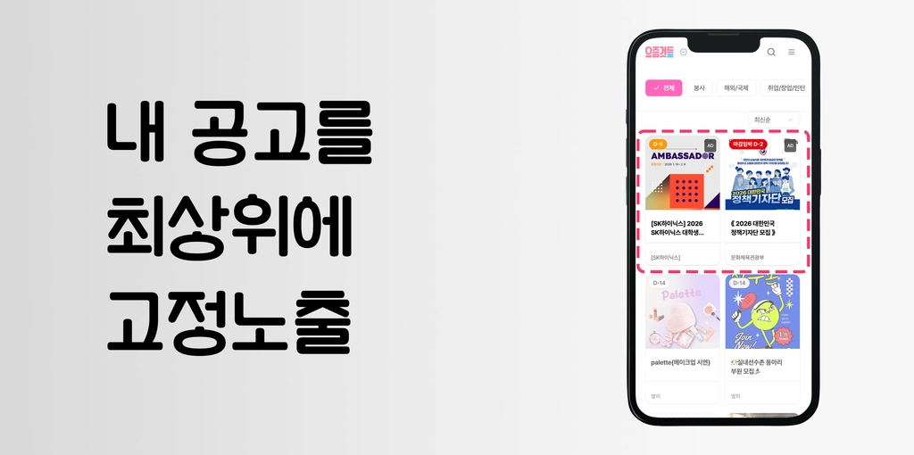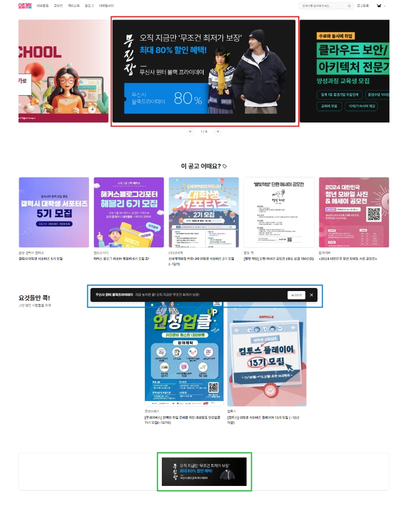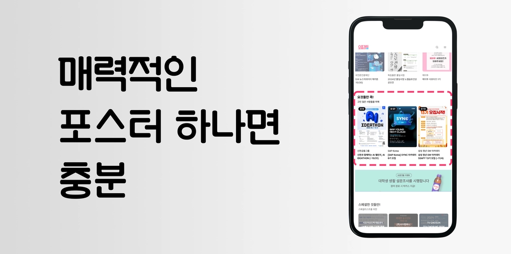[M3]픽배너 | 메인페이지 [요것들만 콕] 1~3순위 구좌 고정 | 60만원 | 6만뷰 | 0.2 ~ 0.3% | 주목도 높은 포스터가 있는 대외활동/공모전/교육 |