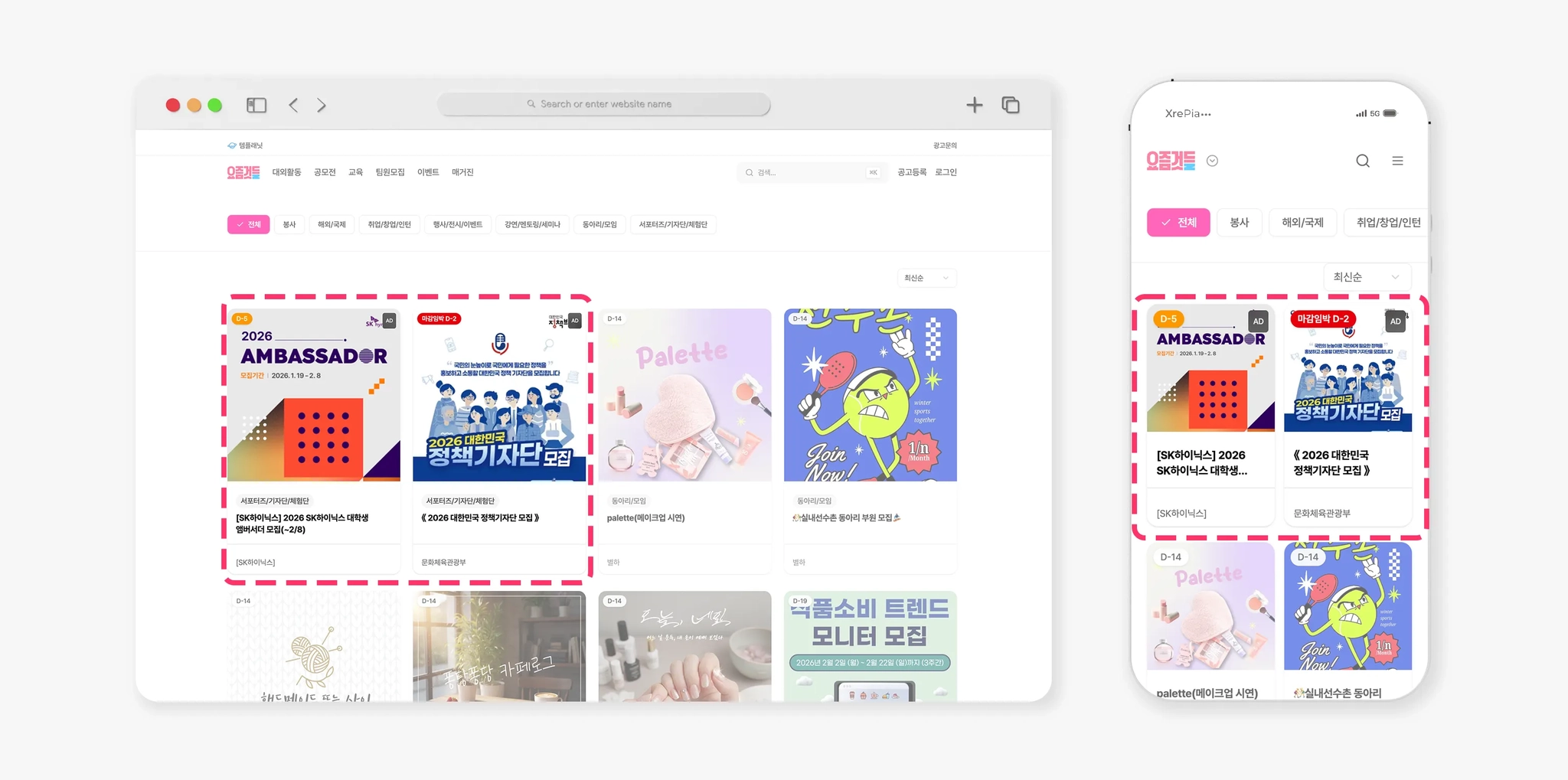 대외활동/공모전/국비교육 공고를 탐색하는 유저들에게 내 공고를 최상위 순위로 유지하여 간접적인 타게팅 홍보를 할 수 있어요