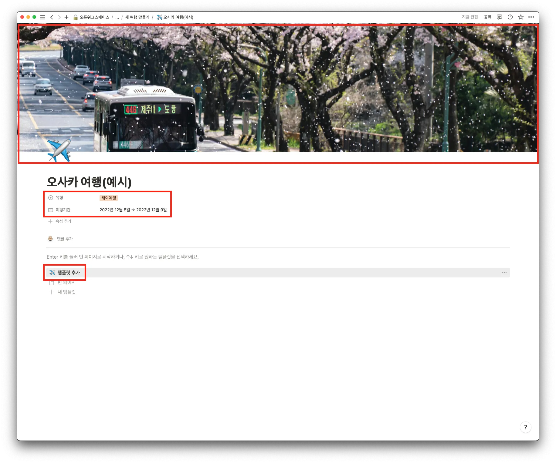 빨강색 박스로 표시된 곳에 여행 계획을 세우시면 됩니다
