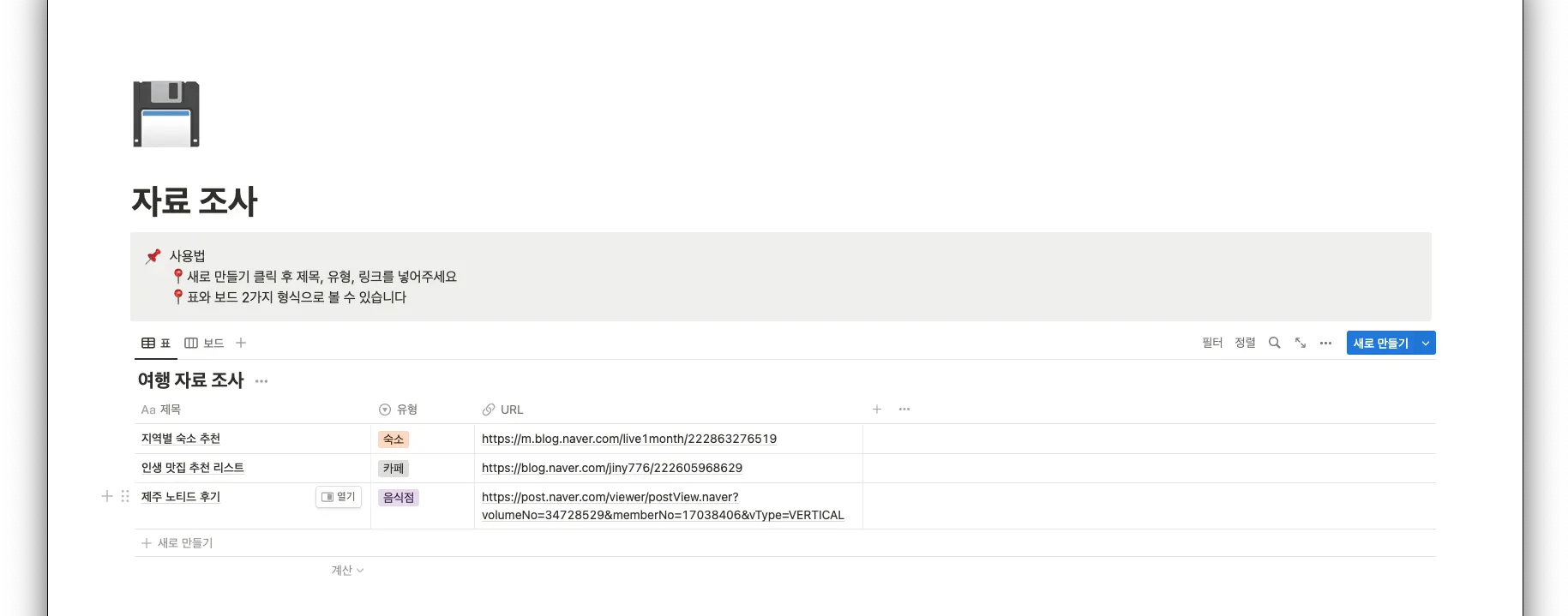 여행을 하다 보면 검색을 많이 하는데 자료조사 페이지에서 효율적으로 관리할 수 있어요