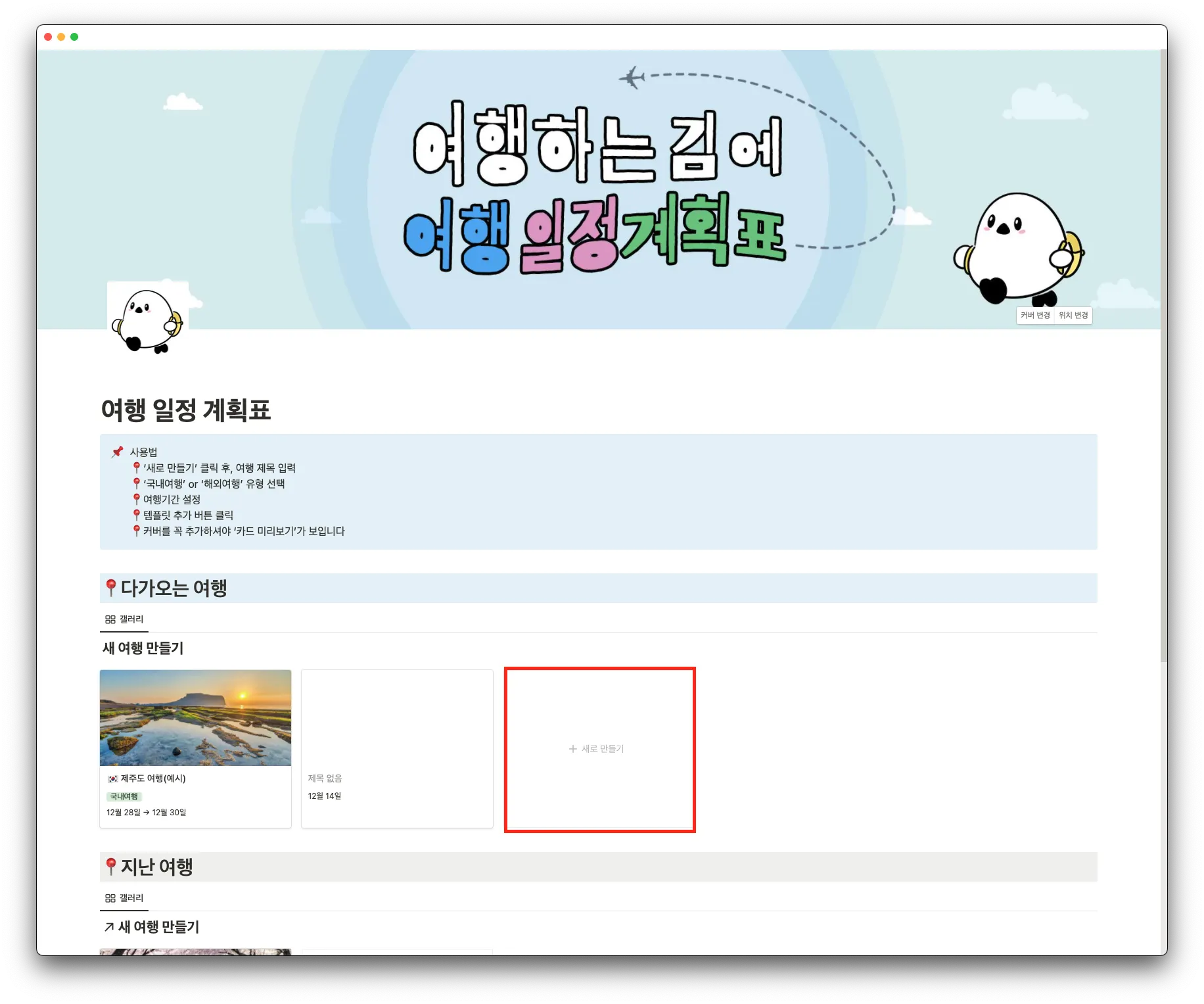 새로운 여행계획을 추가하려면 '+새로 만들기'을 클릭